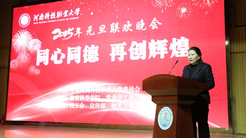李海燕代表校领导班子向全体师生致以新年的美好祝愿和诚挚问候。她指出,在省教育厅、市委和市政府的坚强领导下,全校师生员工以习近平新时代中国特色社会主义思想为指导,深入学习贯彻党的二十大、二十届三中全会和全国、全省教育大会精神,秉承“厚德博学、求实创新”校训,落实“以人为本,德育为先,能力为重,质量为根”的办学理念,促进了学校的可持续发展,并且在人才培养质量、科研成果、校企合作、产教融合等方面成绩显著。新校区建设顺利,办学条件显著改善,学校各项工作都上了一个新的台阶。同时,全校师生在省级和国家级职业技能大赛中获奖348项;教师完成市厅级以上科研项目1355项,发表论文459篇,新增“省大数据发展创新平台”1个,新增“市级重点实验室”2个,新增“市级工业设计研发中心”1个,新增“校企共建研发中心”13个,新增“市级创新型科技团队”2个等。学校9400多个招生计划高质量完成,2024届毕业生综合就业率达96.25%,位居全省高校前列。学校被省民政厅评选为“清廉社会组织建设示范点培树单位和全省百家社会组织党建工作观摩点”;被省教育厅评选为“河南省职业院校骨干教师培训基地”;被河南省民办教育协会评为“助力乡村振兴专项活动先进单位”;被市教体局授予“周口市职业教育工作先进单位”和“周口市全民终身学习先进单位”等荣誉称号。
